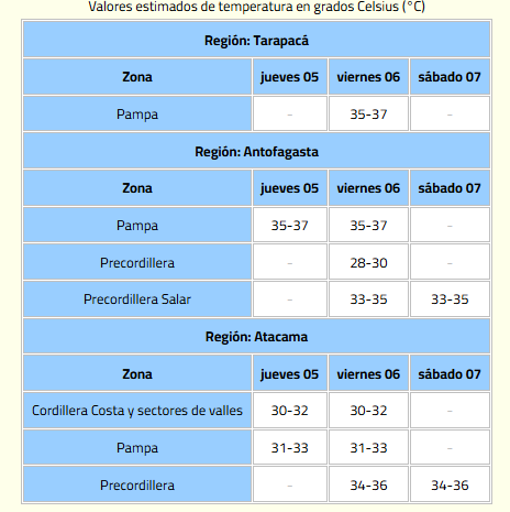 El tercer aviso es por “altas temperaturas” provocadas por un “dorsal en altura” desde la tarde del jueves 5 hasta la tarde del sábado 7 de febrero. En este caso, afectará las regiones de Tarapacá (Pampa), Antofagasta (Pampa, Precordillera, Precordillera Salar) y de Atacama (Cordillera Costa y sectores de valles, Pampa, Precordillera).