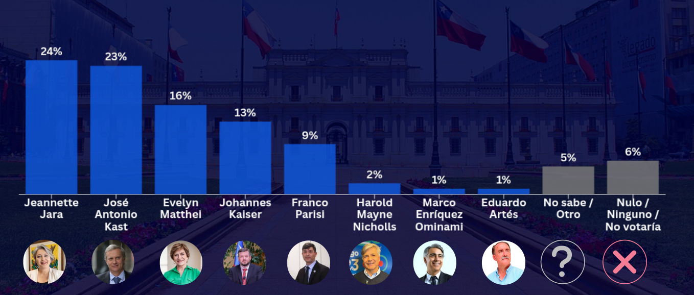 En el sondeo, Jara volvió a liderar con un 24% de apoyo. En segundo lugar aparece Kast, quien retrocede dos puntos y alcanza un 23%, quedando a un punto de la exministra del Trabajo.