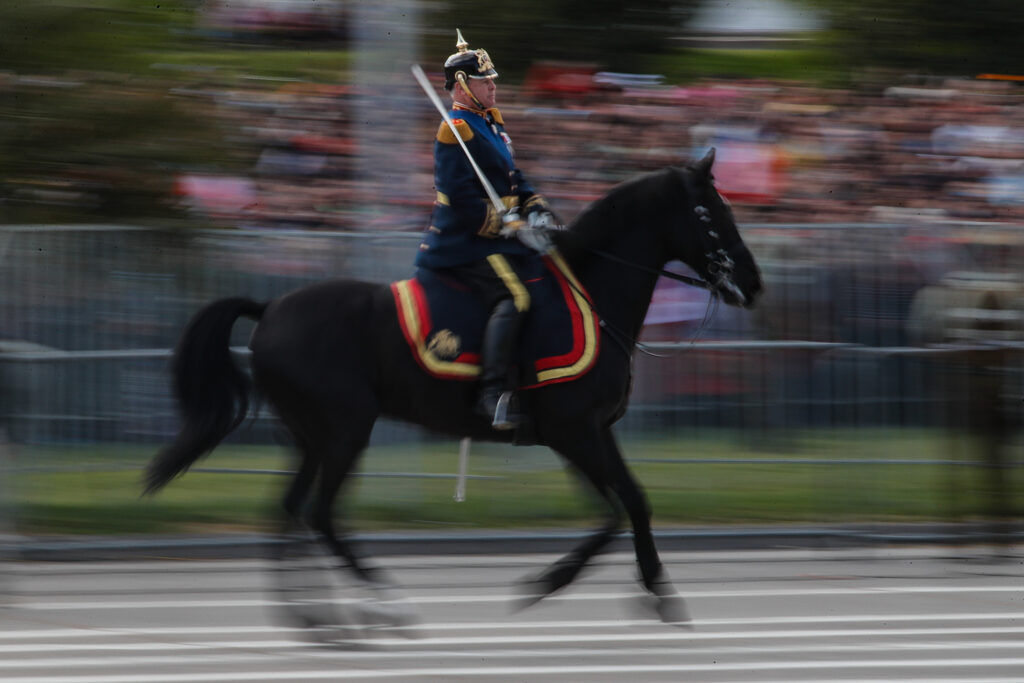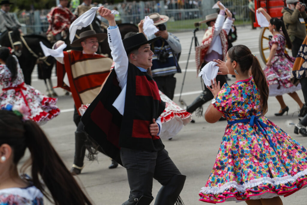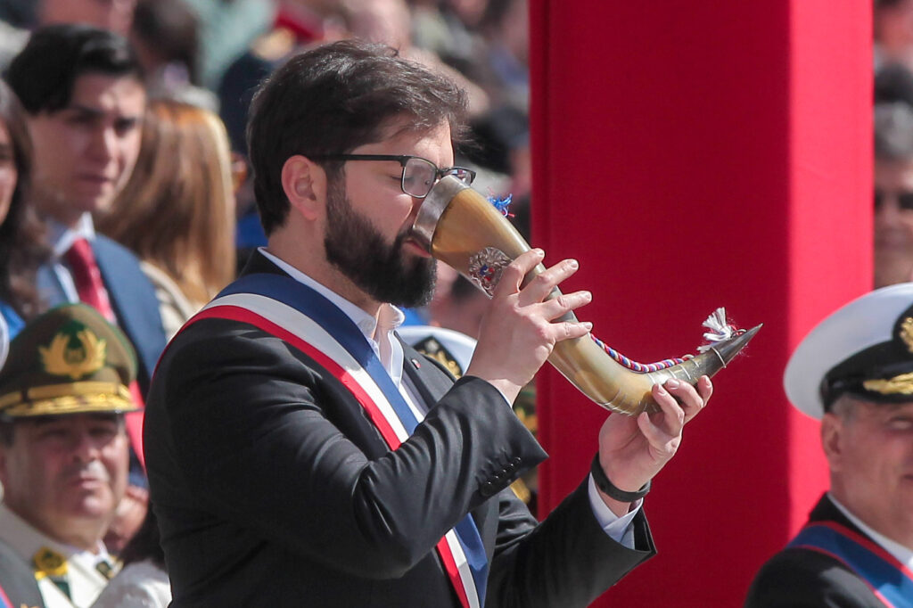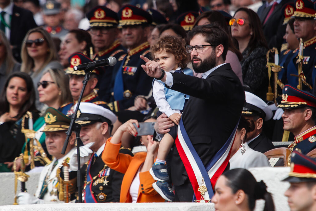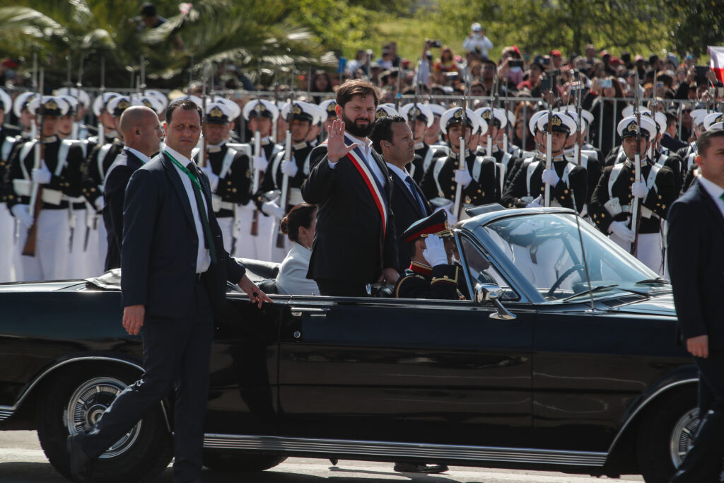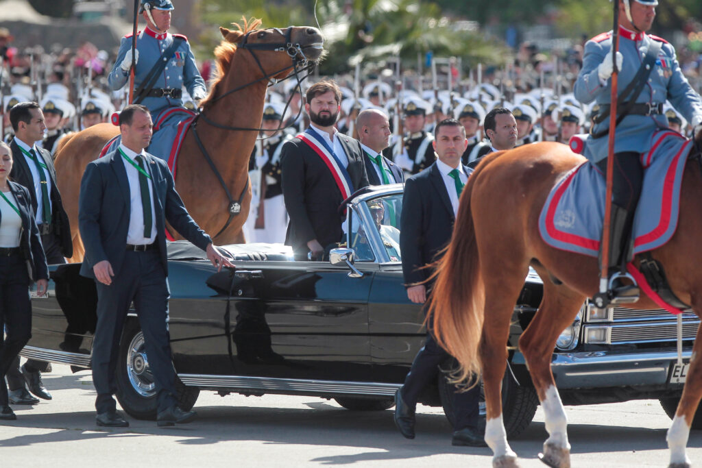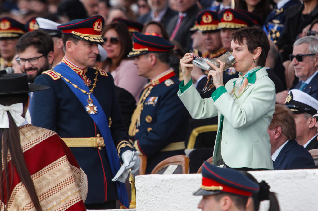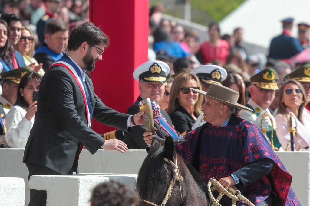 El evento, que comenzó con la llegada del presidente Gabriel Boric y la ministra de Defensa, Maya Fernández Allende, en un Ford Galaxie. El mandatario, por su parte, inauguró la ceremonia recibiendo el tradicional cacho de chicha del club de huasos del Valle de Aconcagua.