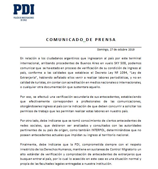 Desde la PDI informaron que nunca estuvieron detenidos, como ellos decían en sus videos. También dijeron que el motivo para obstaculizar el ingreso fue que ellos traían visa de turista y no de trabajo, que es la que corresponde para los comunicadores que pretenden cubrir las manifestaciones.