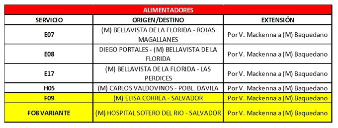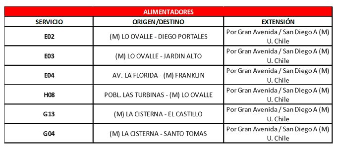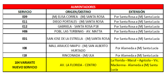 Recorridos E09 – E11- E12 – H06 – E01 – I08 y 118 extienden su operación hasta Metro Santa Lucía. Además se crea el Recorrido 104 que circulará por Av. La Florida, Macul, Agrícola, V. Mackenna y Alameda hasta Metro Santa Lucía.