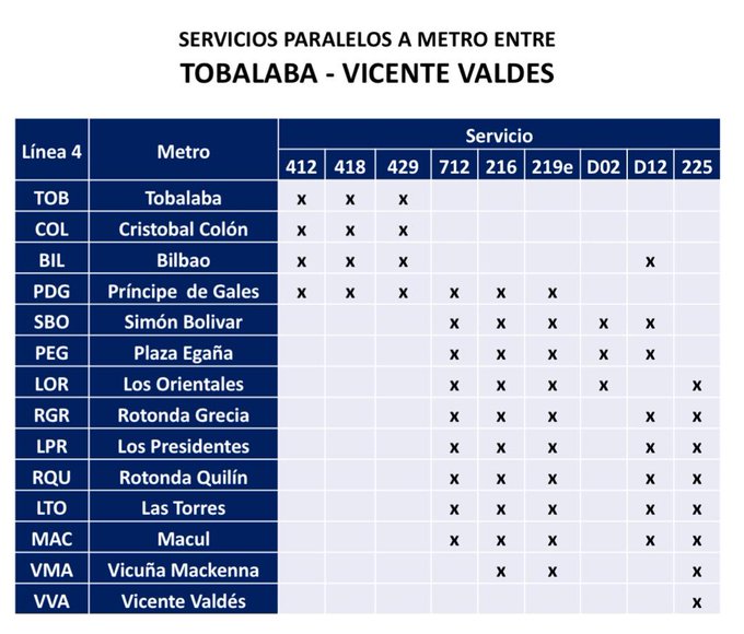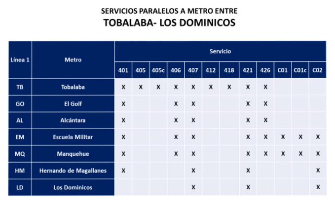 Si este martes te vas a mover entre Tobalaba y Los Dominicos puedes abordar los siguientes servicios paralelos a Metro de Santiago: 401-405-406-407-412-418-421-426-C01-C02 – 405C y C01C.