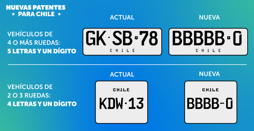 - Los vehículos de cuatro o más ruedas pasarán a utilizar una patente de cinco letras y un dígito, mientras que las motocicletas y vehículos de tres ruedas adoptarán una de cuatro letras y un dígito.