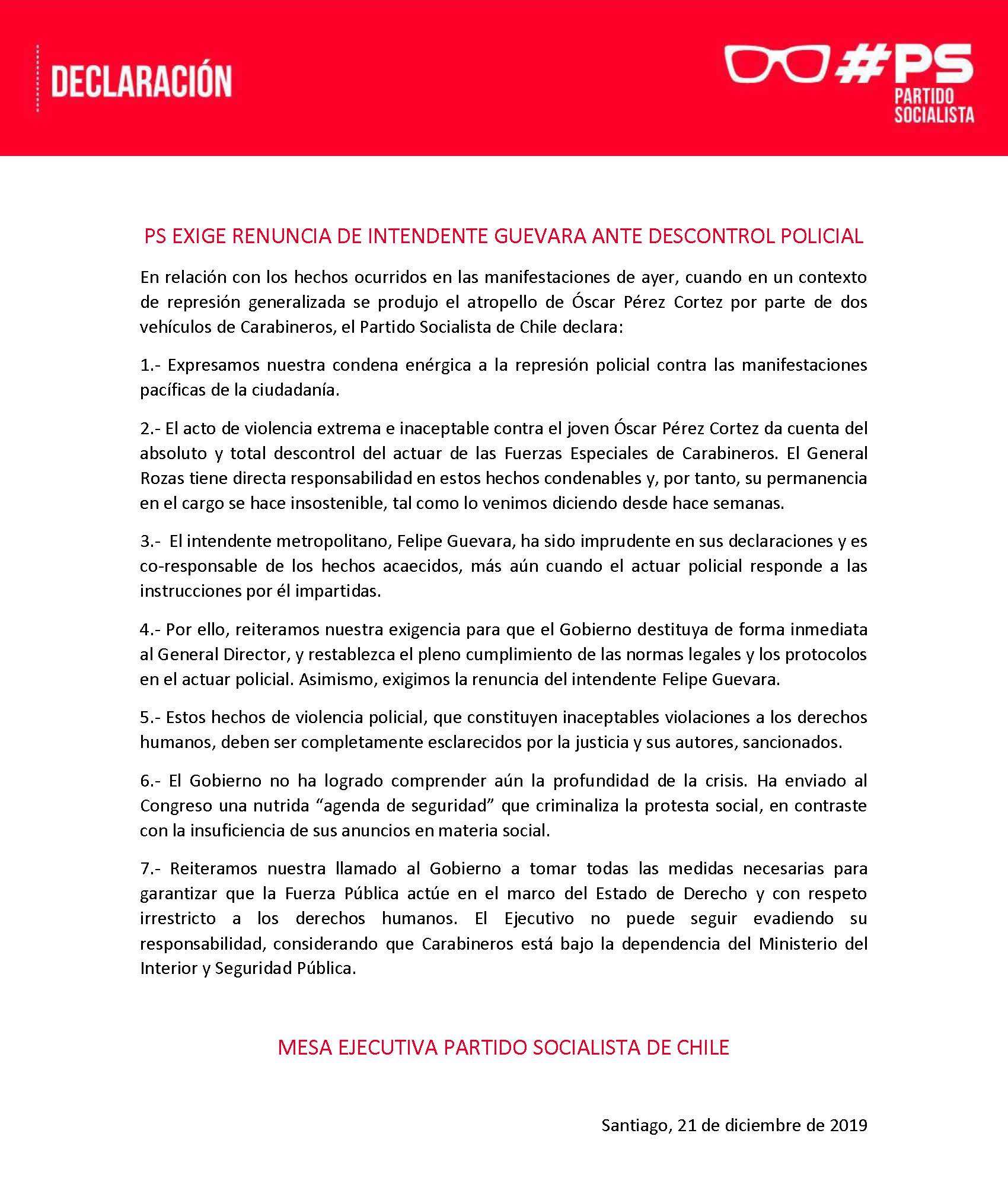 A través de una declaración pública, el Partido Socialista (PS) comunicó que exige la renuncia del intendente de la Región Metropolitana, Felipe Guevara, y la destitución del general director de Carabineros, Mario Rozas.