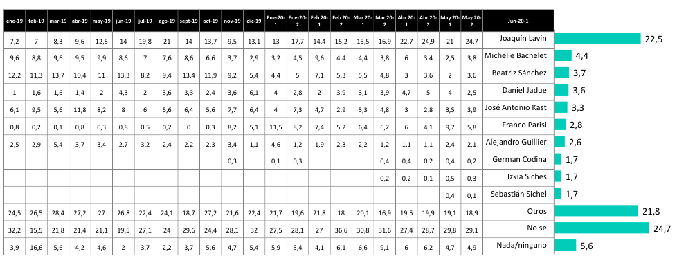 La medición, que fue realizada entre el 11 y 13 de junio, planteó la pregunta: “Pensando en el futuro ¿Quién preferirías que sea el próximo presidente de Chile, excluyendo a Sebastián Piñera?”, que considera respuestas espontáneas por parte de los consultados.