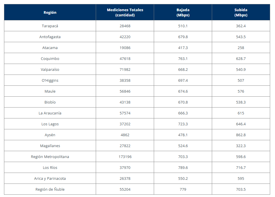 - En el caso de las velocidad de subida, las regiones de Aysén (862,8 Mbps), Los Ríos (716.7 Mbps) y Ñuble (703,5 Mbps) registran las más altas velocidades.
