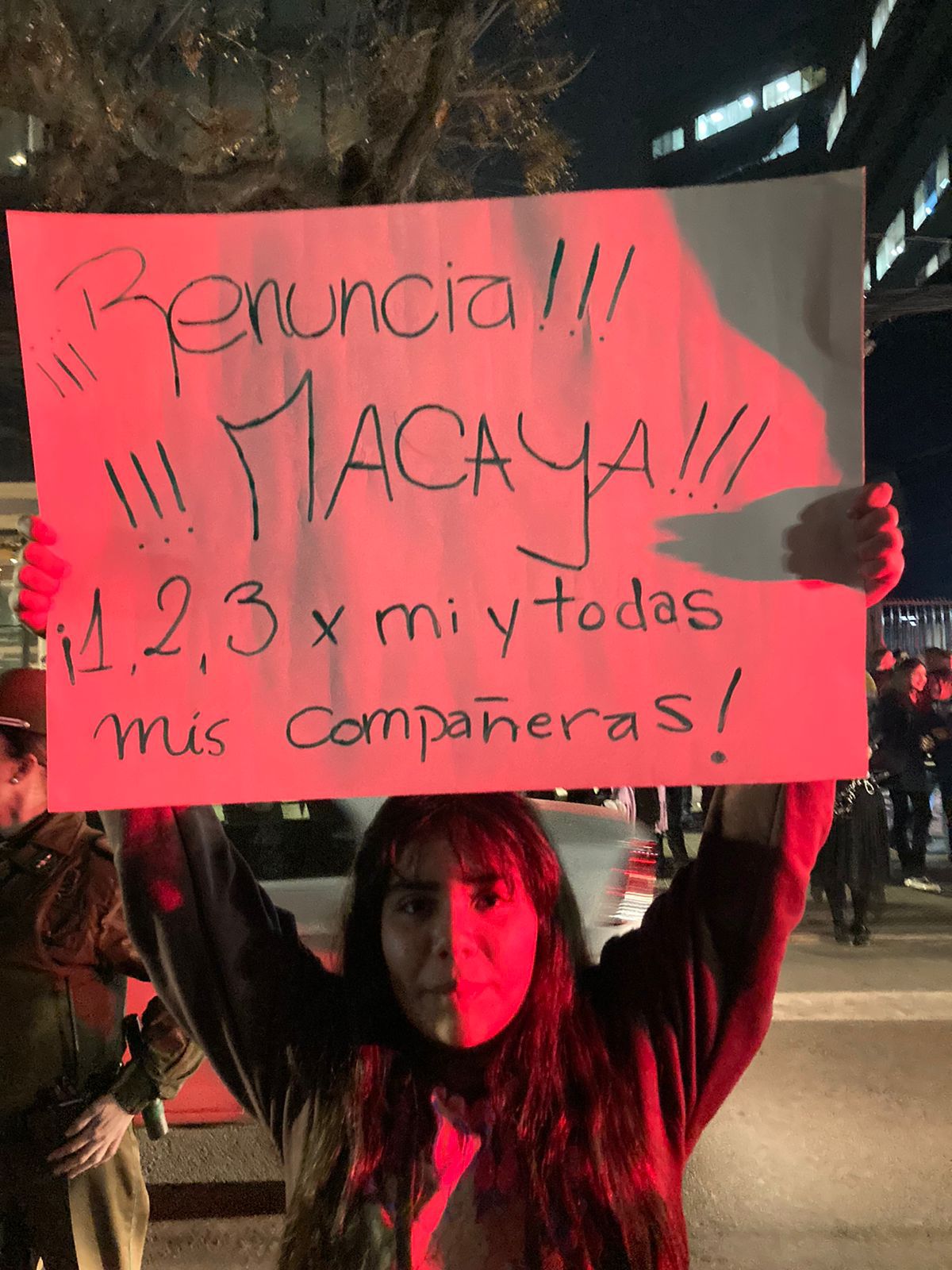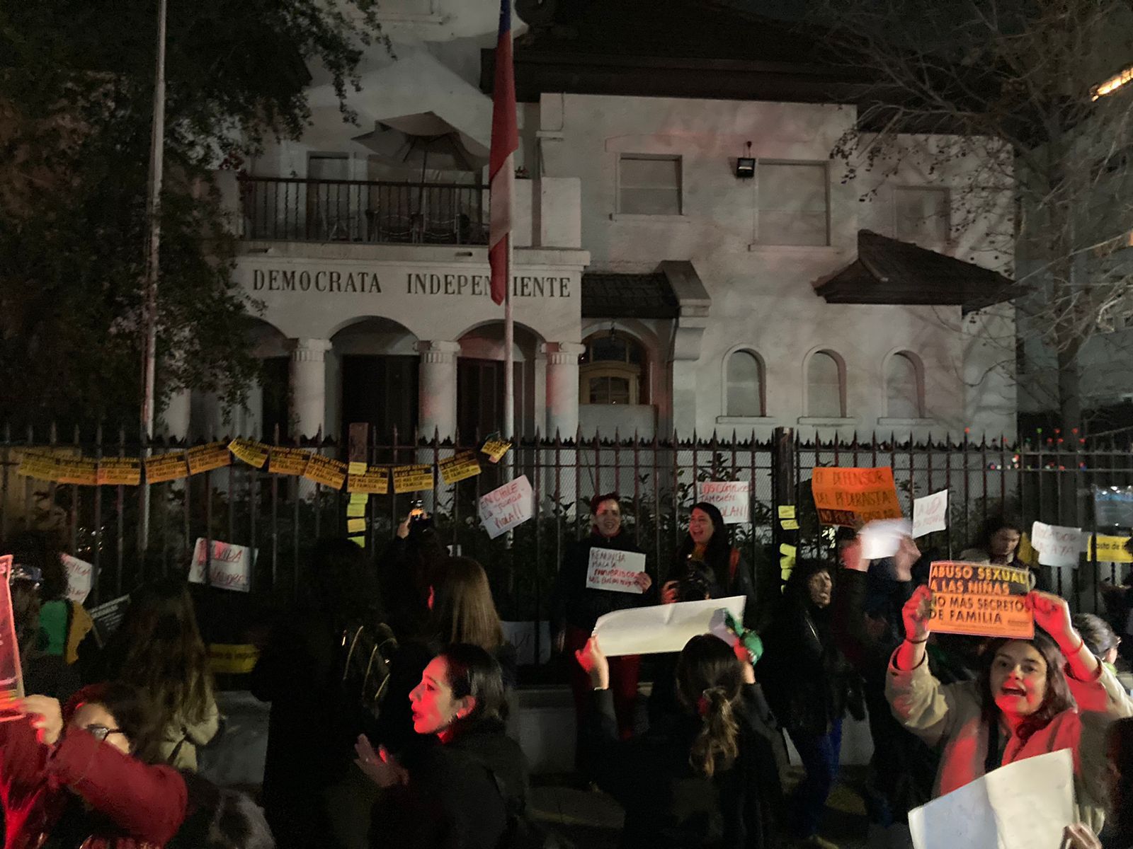 La manifestación, protagonizada principalmente por mujeres pertenecientes a la Red Chilena contra la Violencia hacia las Mujeres, exige la renuncia del senador y presidente del partido, Javier Macaya, quien ha sido ampliamente cuestionado por sus dichos respecto a la condena de 6 años decretada contra su padre, Eduardo Macaya, por el delito de abuso sexual reiterado.