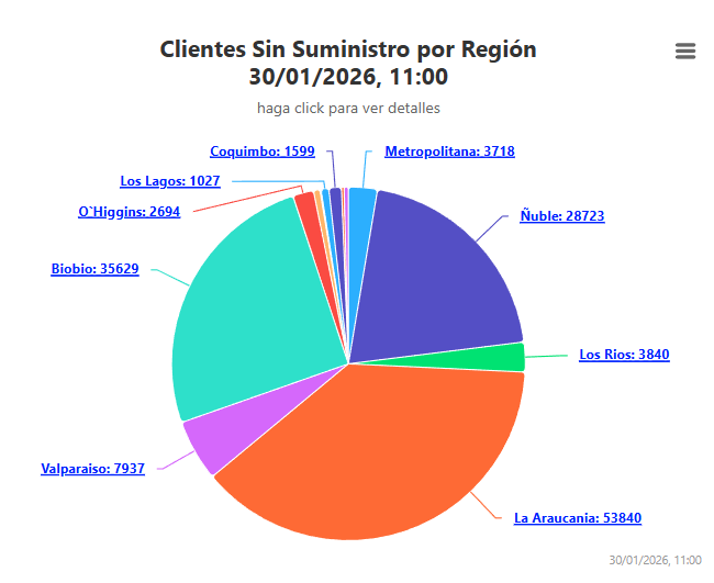 De acuerdo a la información compartida por la Superintendencia de Electricidad y Combustibles (SEC), a eso de las 11:00 horas 140 mil clientes a nivel nacional permanecen sin suministro eléctrico.