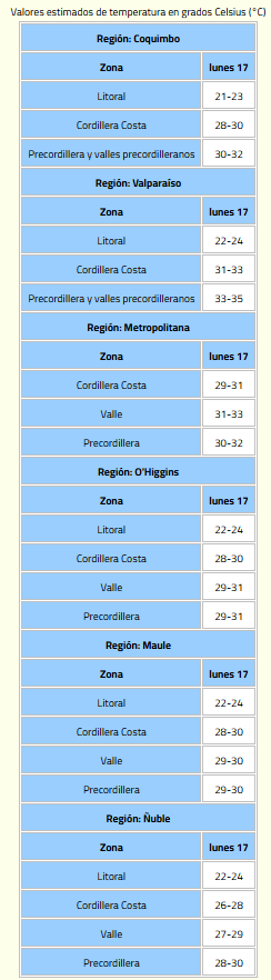 - Región Metropolitana (Cordillera Costa, Valle, Precordillera)