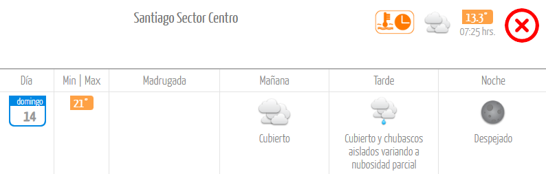 - De acuerdo con la Dirección Meteorológica de Chile (DMC), este 14 de diciembre en la mañana estará cubierto, mientras que para la tarde se proyecta que esté cubierto y con chubascos aislados variando a nubosidad parcial, y en la noche el clima estará despejado.