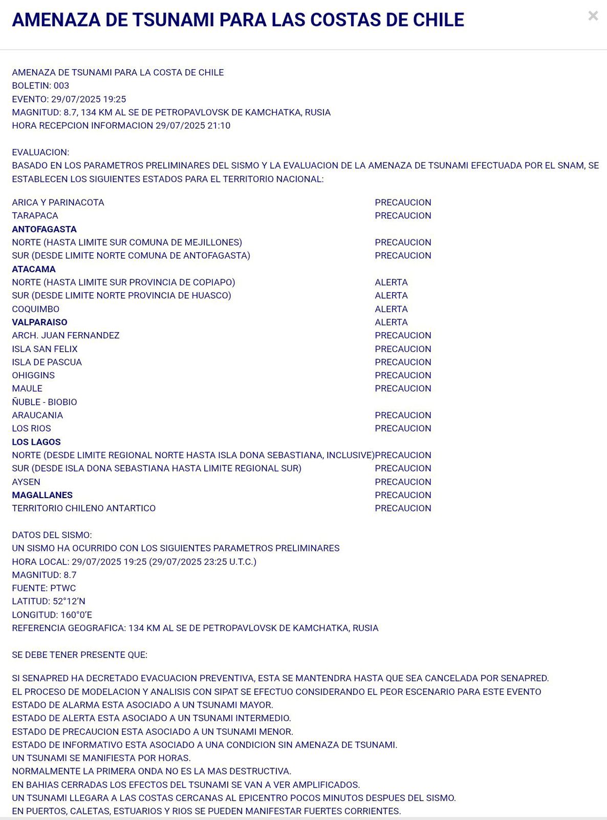 El Servicio Hidrográfico y Oceanográfico de la Armada de Chile (SHOA) informó durante la noche de este martes sobre una amenaza de tsunami para las costas del país, luego del terremoto registrado en Rusia.
