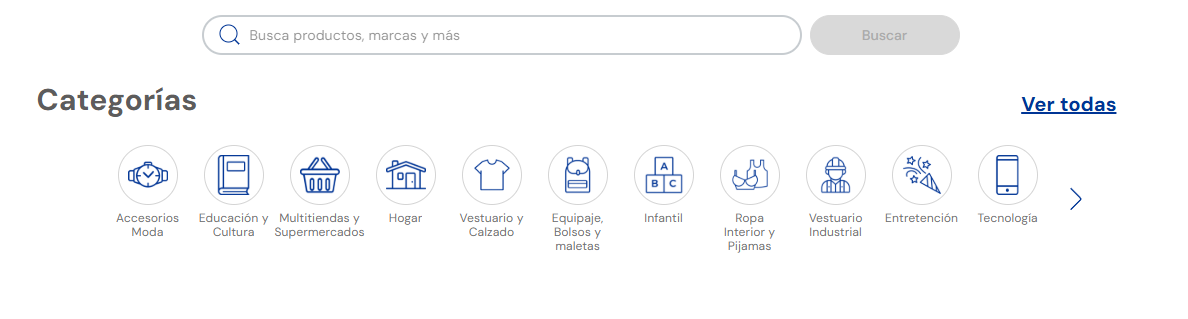 - Las principales categorías incluyen vestuario, calzado y accesorios (109), hogar (54), salud y belleza (74), deportes y outdoor (49), tecnología (36) y turismo (23).