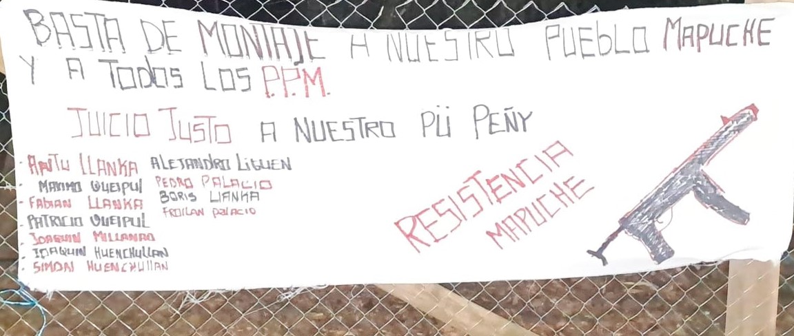 “Basta de montaje a nuestro pueblo mapuche y a todos los PPM (presos políticos mapuche). Juicio justo a nuestro pü peñy”, decía el cartel. Además, se presentó una lista con 11 nombres de comuneros mapuche.