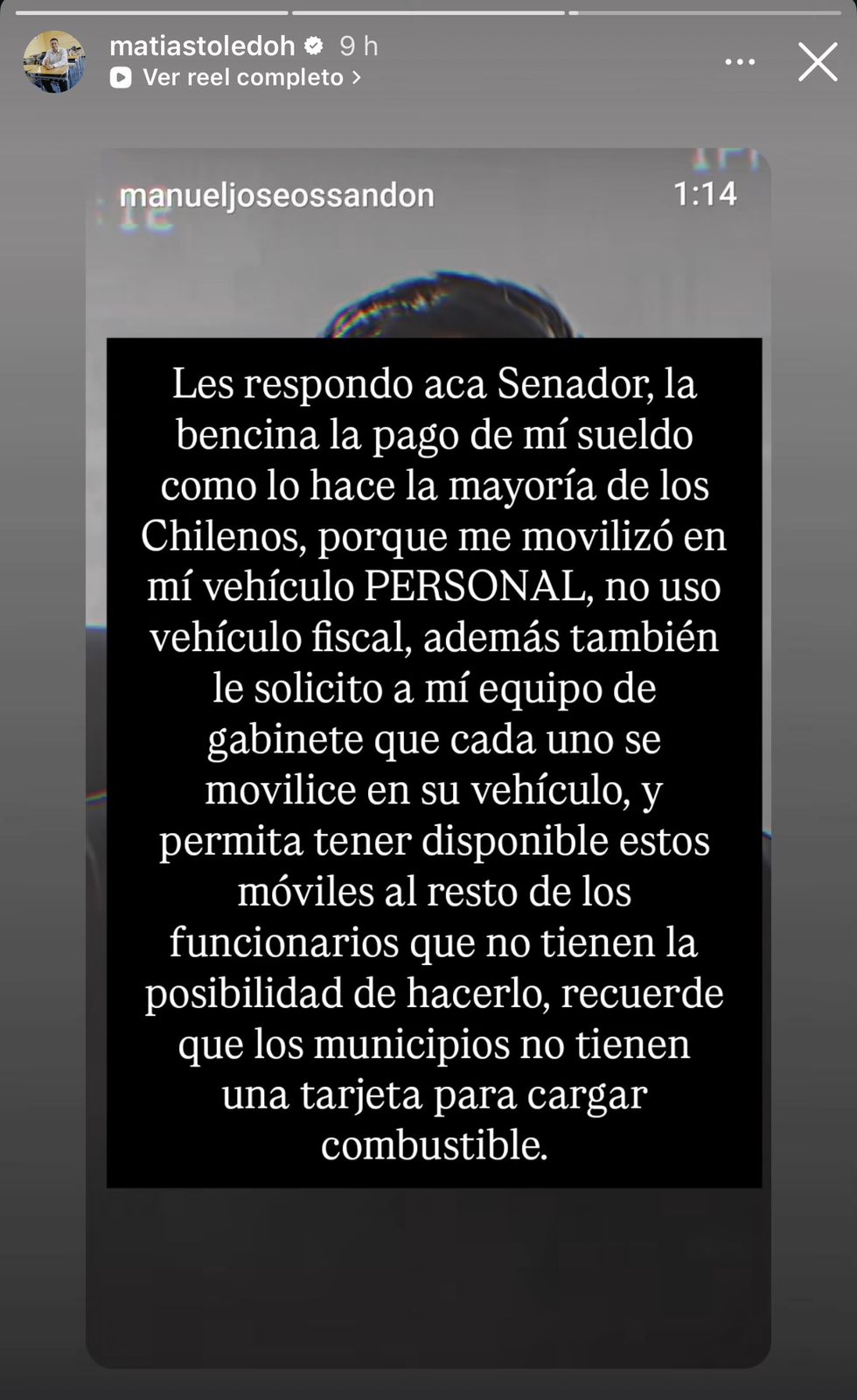 Horas más tarde, el jefe comunal volvió a referise a su cruce con el parlamentario, a quién le respondió por medio de una historia de Instagram lo siguiente: