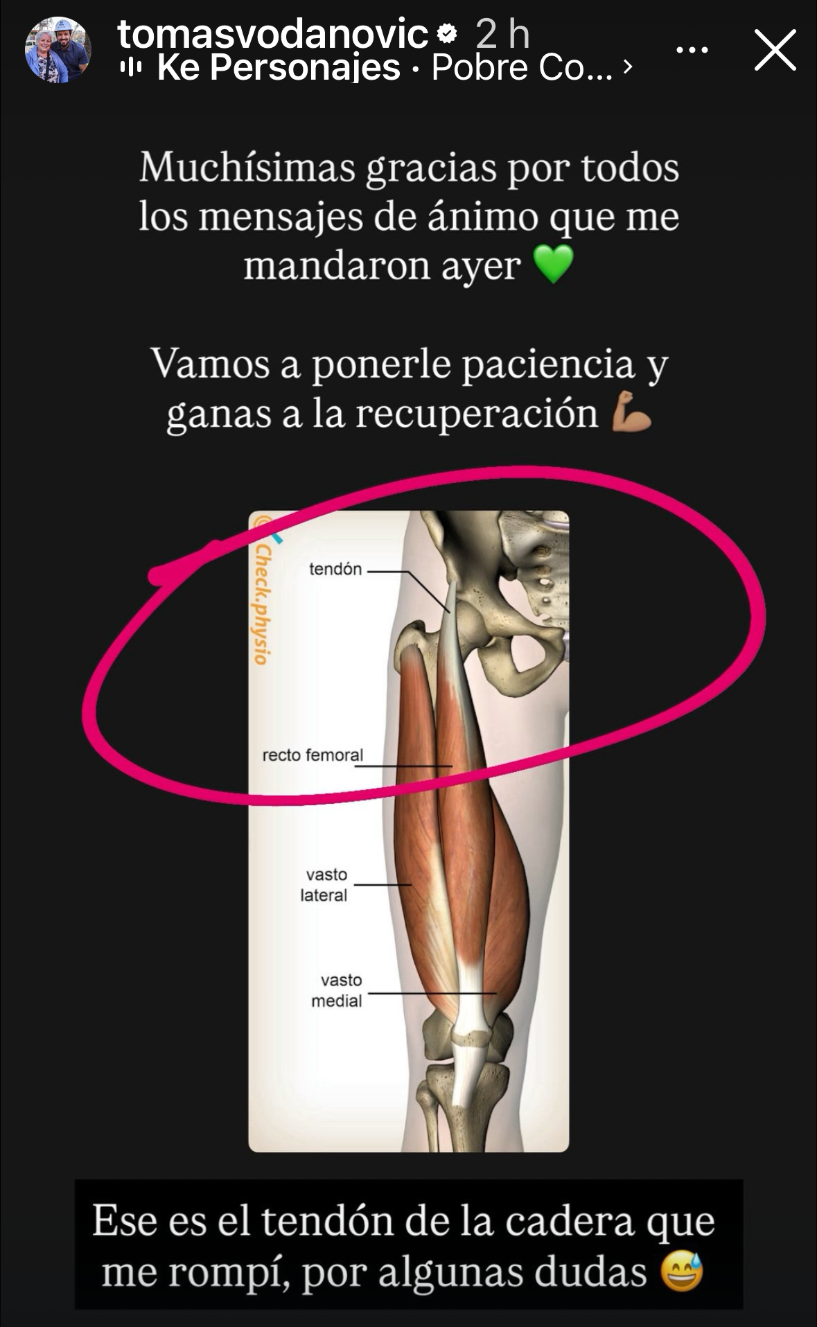 “Ese es el tendón de la cadera que me rompí, por algunas dudas”, precisó junto a la imagen de referencia.