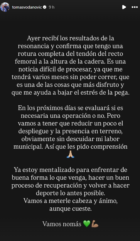 El alcalde de Maipú, Tomás Vodanovic, reveló este viernes que fue diagnosticado con una rotura completa del tendón del recto femoral a la altura de la cadera, una lesión severa que lo obligará a detener su entrenamiento deportivo y reducir significativamente sus actividades en terreno.