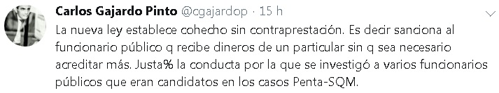 Entre estos estuvo el ex fiscal Carlos Gajardo, ex persecutor encargado de indagar sus ilícitos, quien señaló en su cuenta personal que el proyecto votado “sanciona al funcionario público que recibe dineros de un particular sin que sea necesario acreditar más. Justamente la conducta por la que se investigó a varios funcionarios públicos que eran candidatos en los casos Penta-SQM”.