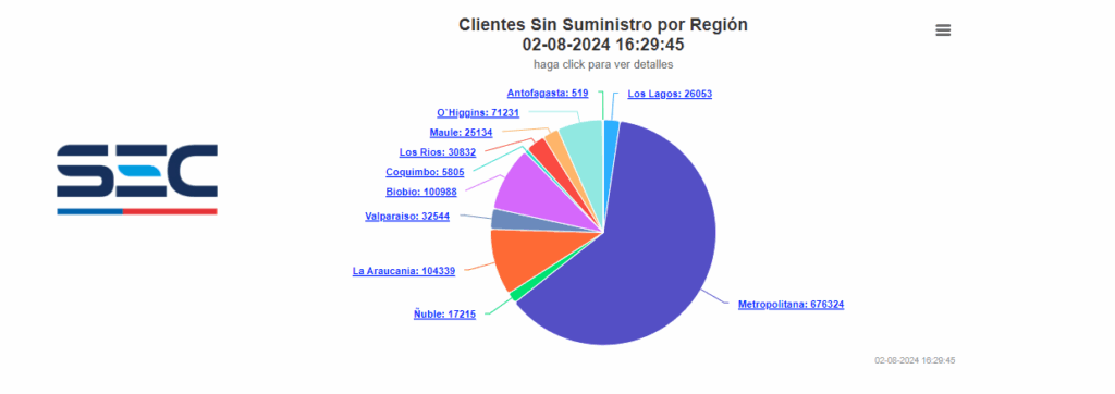 A nivel nacional, el organismo reporta que 1.106.774 clientes están sin suministro eléctrico a causa de las condiciones meteorológicas adversas.