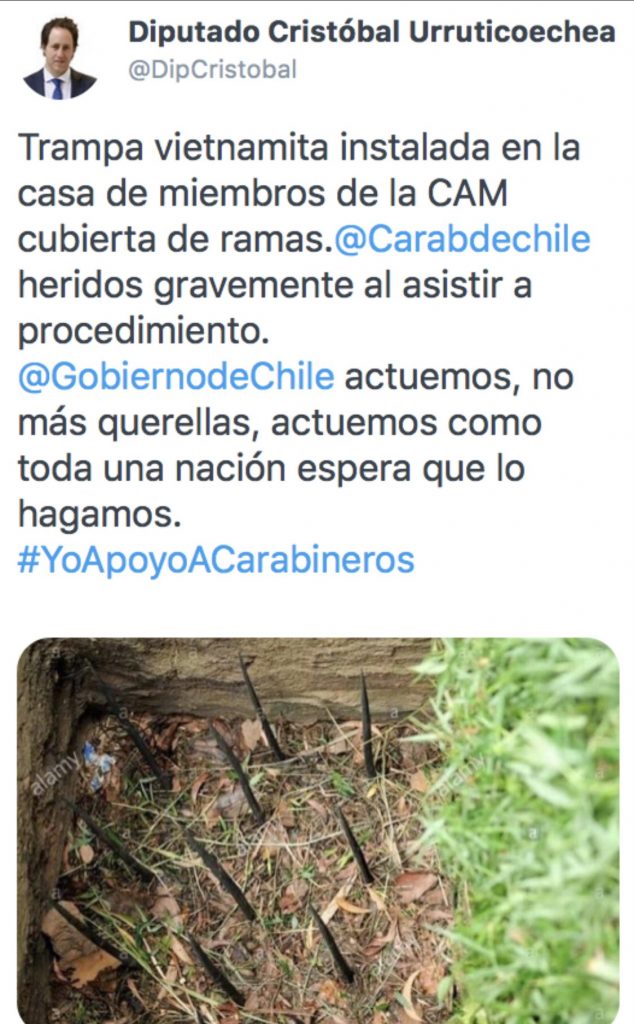 Incluso compartió una fotografía de la supuesta trampa cubierta con ramas, sosteniendo que funcionarios de Carabineros habrían resultado gravemente heridos tras ser víctimas de dicho procedimiento.
