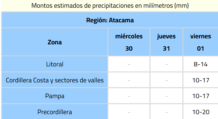 - Región de Atacama (Litoral, Cordillera Costa y sectores de valles, Pampa, Precordillera)