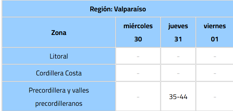 - Región de Valparaíso (Precordillera y valles precordilleranos)