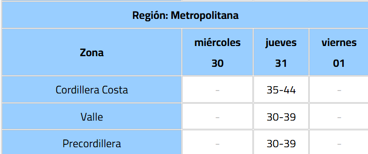 - Región de Metropolitana (Cordillera Costa, Valle, Precordillera)