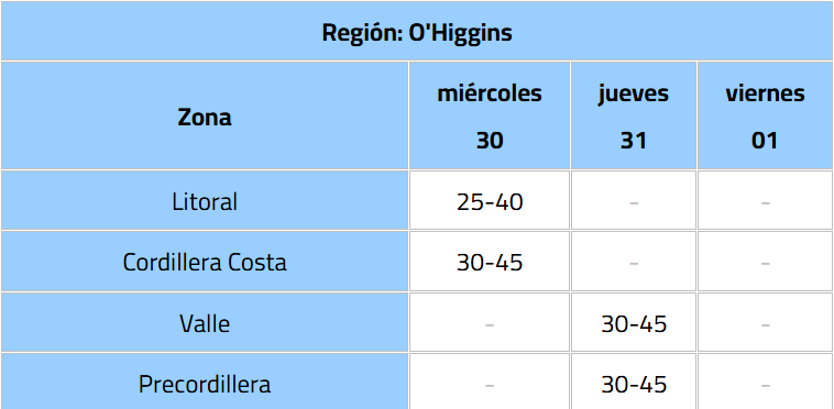 - Región de O’Higgins (Litoral, Cordillera Costa, Valle, Precordillera)