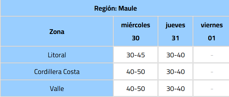 - Región del Maule (Litoral, Cordillera Costa, Valle)