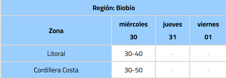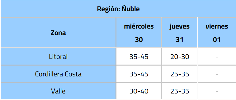 - Región del Ñuble (Litoral, Cordillera Costa, Valle)