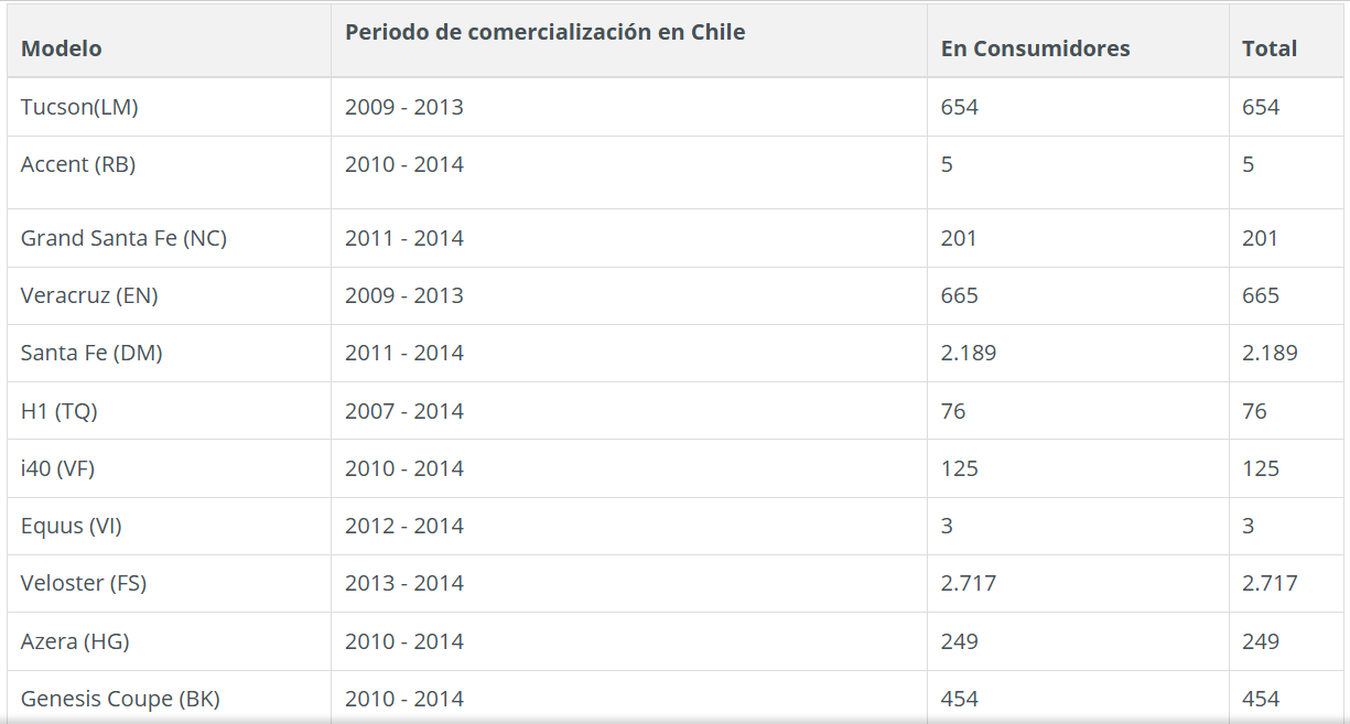 - Se trata de 11 modelos de vehículos Hyundai, los que fueron comercializados en Chile del 2009 a 2014. En total, las unidades afectadas son 7.338.