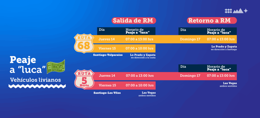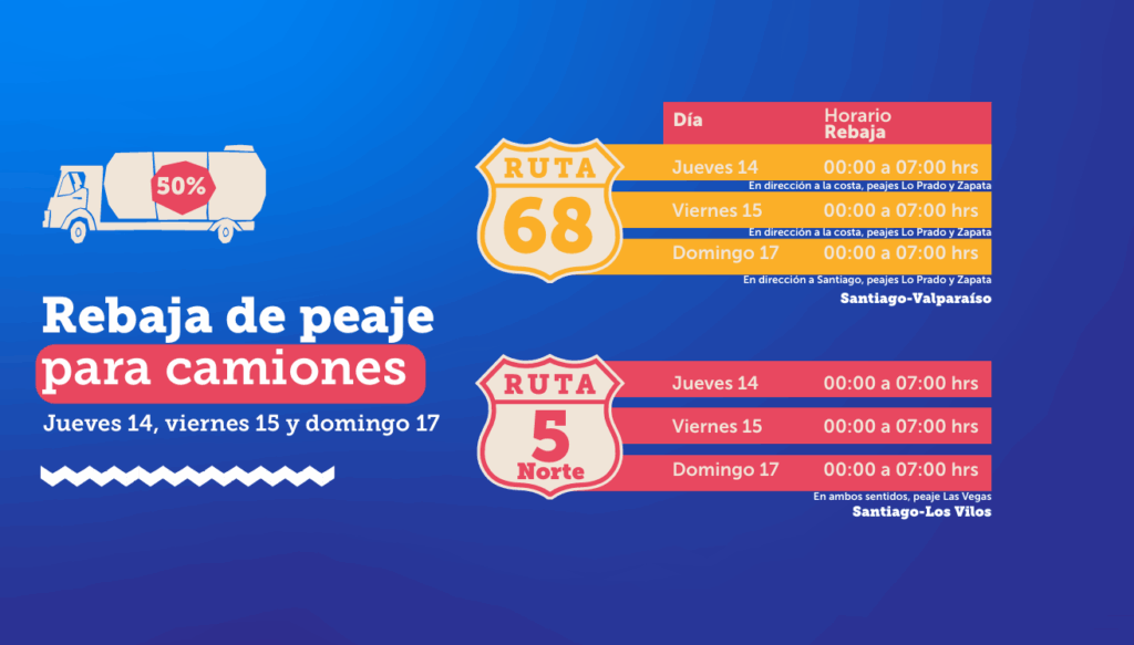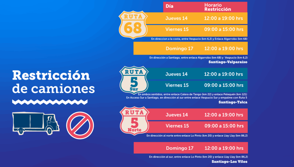 - El jueves 14: restricción de camiones, entre las 12:00 y 19:00 horas en la Ruta 68 Santiago-Valparaíso, en la Ruta 5 Norte Santiago-Los Vilos y en la Ruta 5 Sur Santiago-Talca. Además, habrá “peaje a luca”, entre las 07:00 y 13:00 horas en los peajes Lo Prado y Zapata en la Ruta 68 y en el peaje Las Vegas en la Ruta 5 Norte.