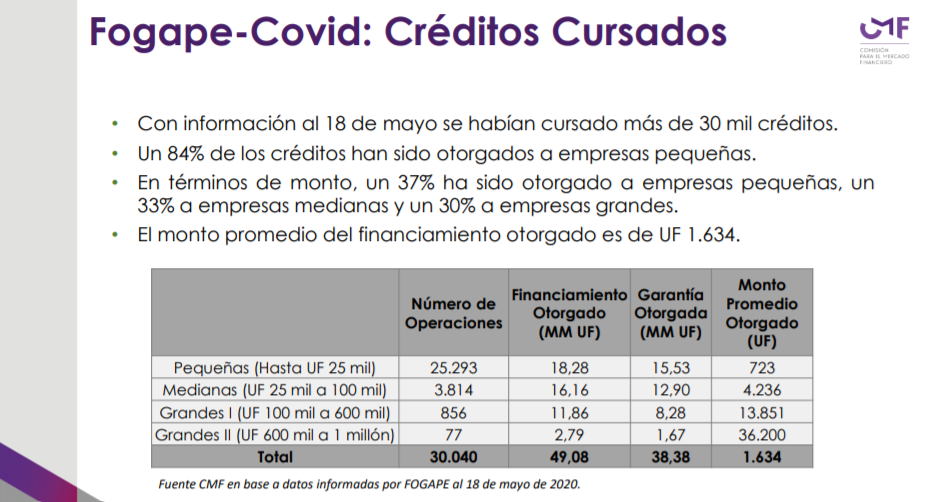 En la práctica, al 18 de mayo se han cursado más de 30 mil créditos, de los cuales un 84% han sido recibidos por empresas pequeñas -hasta 25 mil UF-. En términos de monto, un 37% ha sido otorgado a pequeñas empresas, un 33% a medianas y un 30% a grandes.