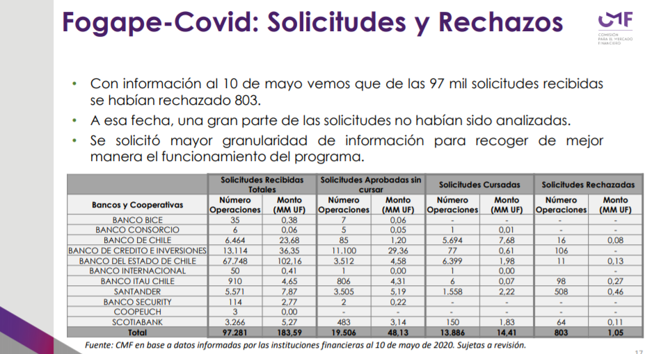 La Comisión de Mercado Financiero (CMF) entregó un informe sobre el funcionamiento de la línea de créditos con aval del Estado, también conocidos como los “créditos COVID-19” o créditos Fogape.