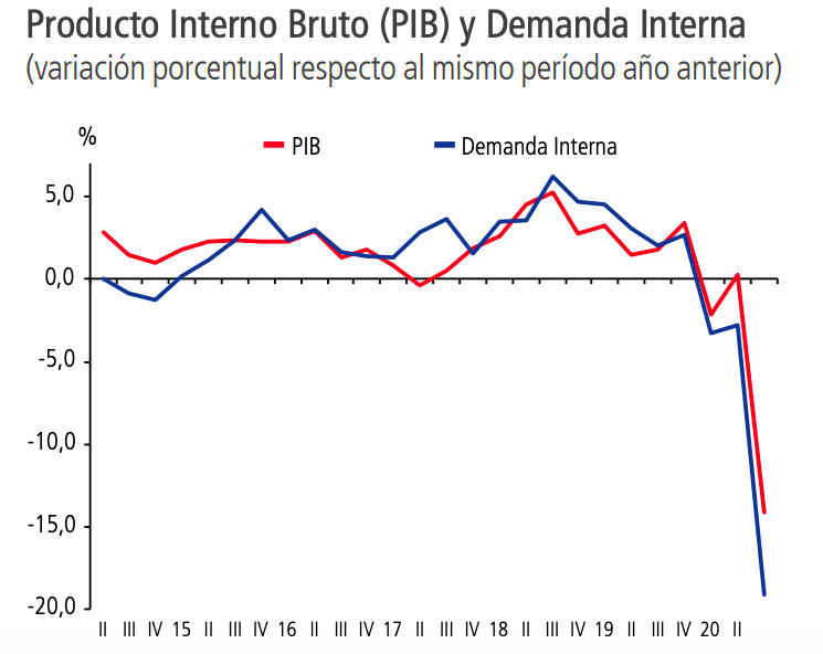 De acuerdo al ente emisor, la demanda interna determinó el resultado del PIB al anotar una caída de 19,1% (-2,8% en el primer trimestre).