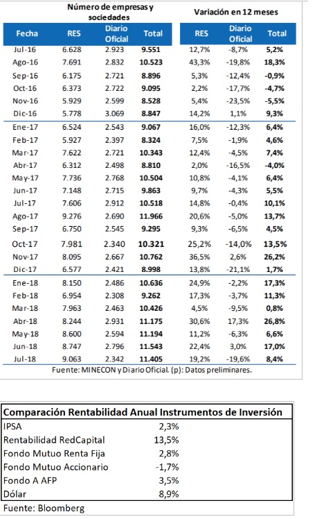 En el mes de julio de 2018 se constituyeron 11.405 empresas y sociedades en el país. De las cuales el 79,5% se hizo a través del Registro de Empresas y Sociedades (RES) y el 20,5% restante, a través del Diario Oficial, según el informe Radar Pyme de RedCapital.
