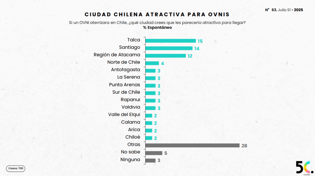 Si un OVNI aterrizara en Chile, Talca sería la ciudad más atractiva para recibirlos, con un 15% de las preferencias, seguida de Santiago con un 14%, la Región de Atacama (12%) y el norte del país (4%).