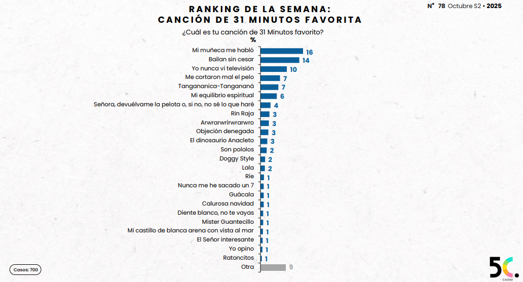 La decisión no fue fácil. "31 minutos" cuenta con un amplio repertorio musical, pero según los resultados del Estudio 5C, el primer lugar lo ocupa "Mi muñeca me habló", seguido por "Bailan sin cesar", y en tercer lugar, "Yo nunca vi televisión".