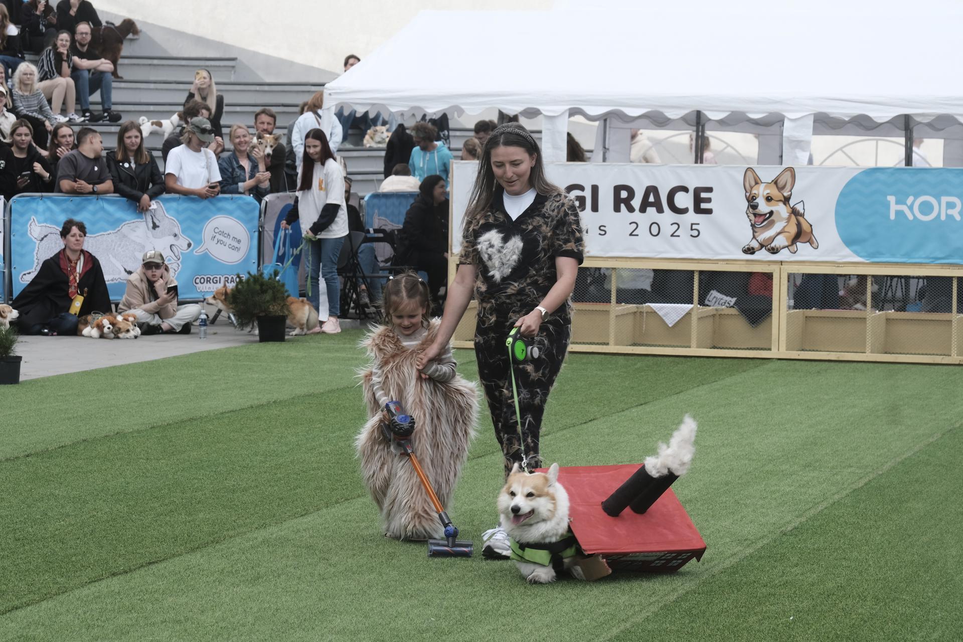 Vilnius (Lithuania), 23/08/2025.- A woman with her daugter and a corgi participates in a costume contest during the ‘Corgi Race Vilnius 2025’ event at Vingis park in Vilnius, Lithuania, 23 August 2025. EFE/EPA/VALDA KALNINA.