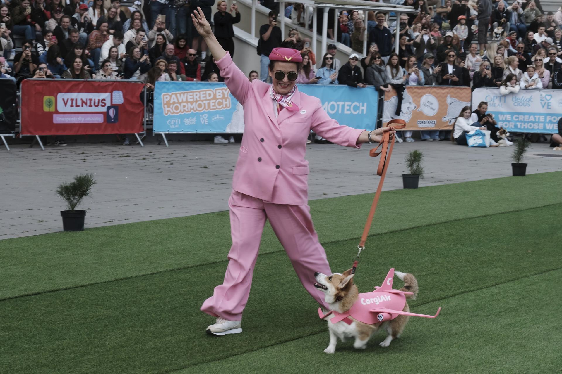 Vilnius (Lithuania), 23/08/2025.- A woman with her corgi participates in a costume contest during the ‘Corgi Race Vilnius 2025’ event at Vingis park in Vilnius, Lithuania, 23 August 2025. EFE/EPA/VALDA KALNINA