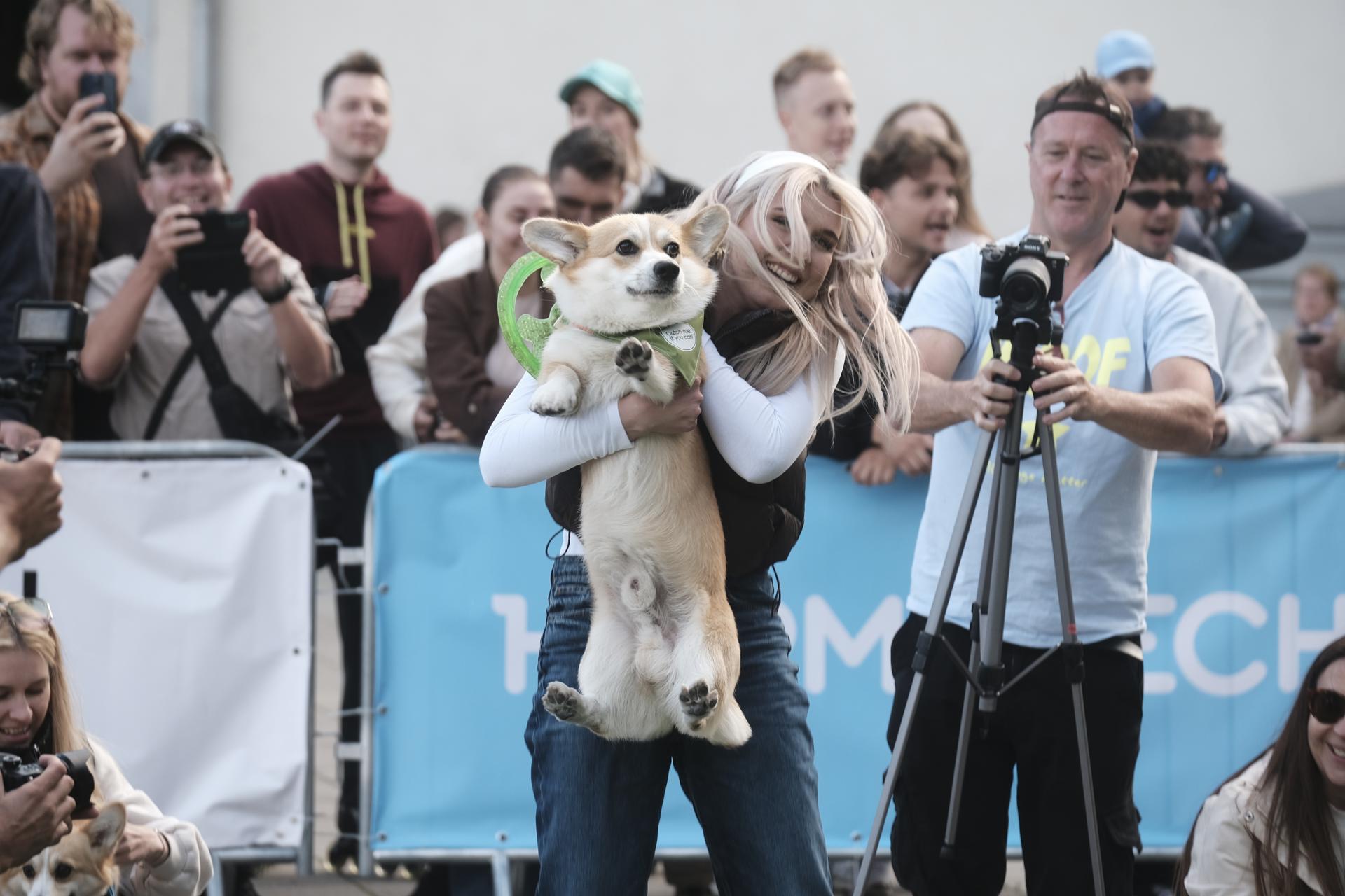 Vilnius (Lithuania), 23/08/2025.- Corgi race winner, Mango (C), celebrates with his owner during the ‘Corgi Race Vilnius 2025’ event at Vingis park in Vilnius, Lithuania. EFE/EPA/VALDA KALNINA.