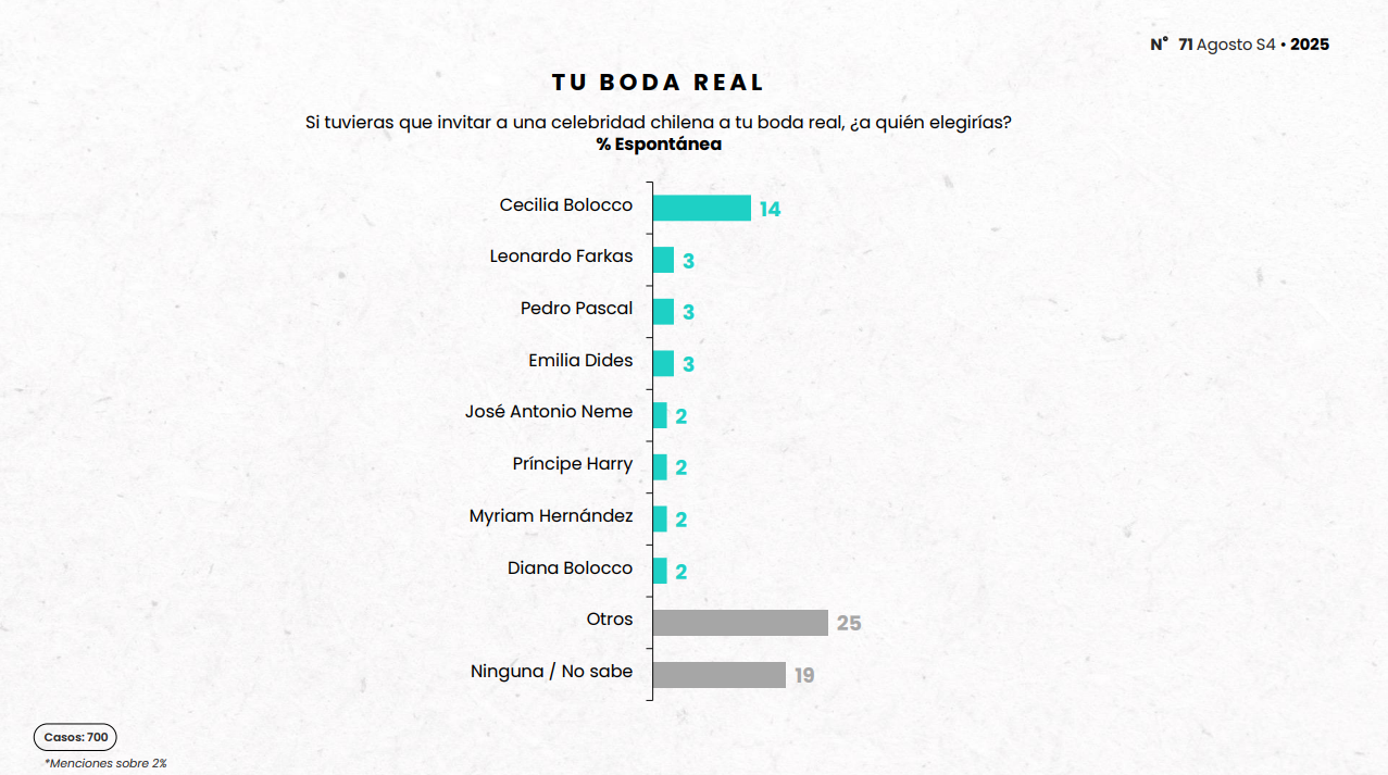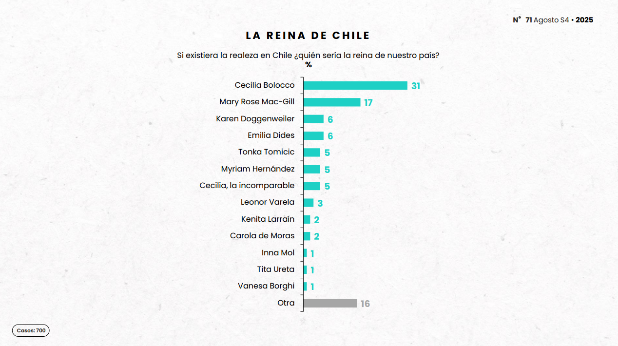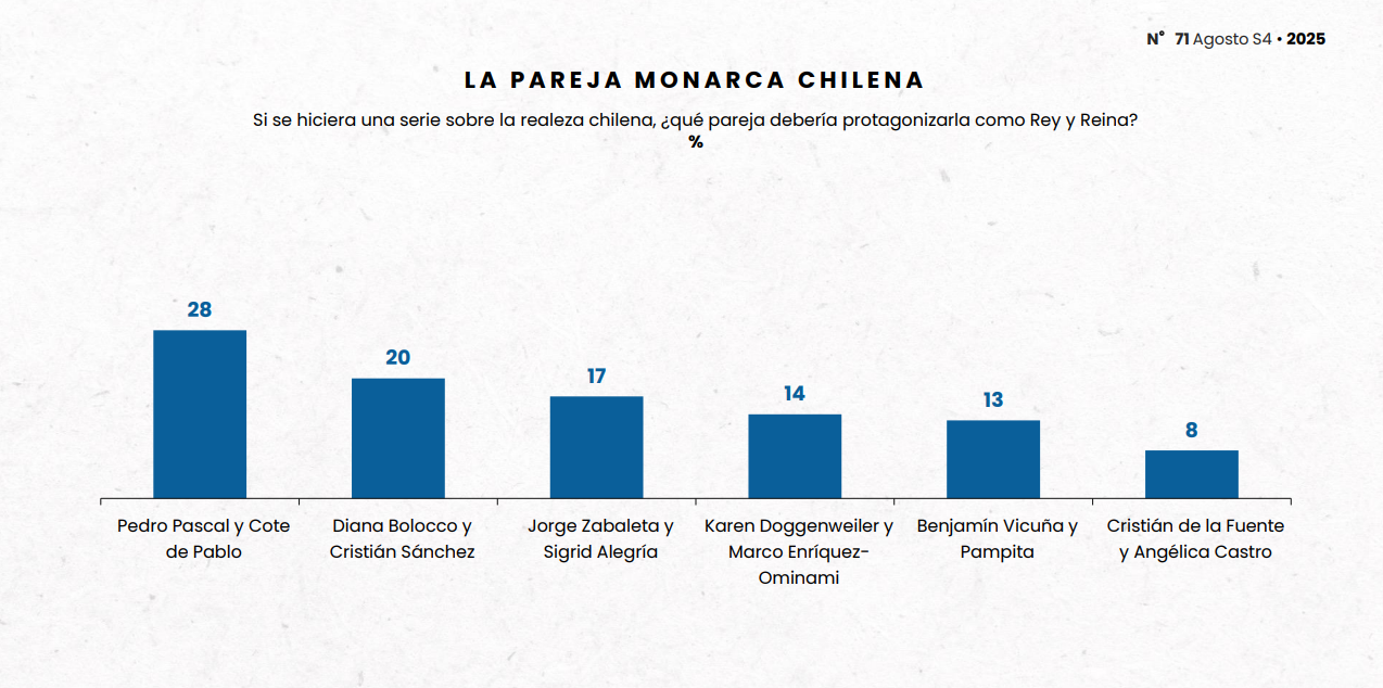 En el sondeo, los consultados señalaron que, si existiera la realeza en Chile, escogerían como reina a la Miss Universo Cecilia Bolocco, junto a Myriam Hernández y Emilia Dides. Además, si se realizara una serie sobre la monarquía chilena, la pareja que la ciudadanía elegiría como protagonistas sería el actor Pedro Pascal y Cote de Pablo.